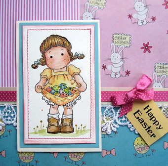 If you aren't wearing an apron then lift up your skirt and fill it with eggs...chocolate ones of course.I made this card for you using one of my Magnolia Tilda rubber stamps. She's a great favourite of mine.
