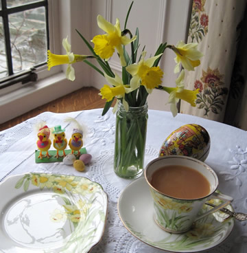 With golden daffodils in the background I had hoped we could enjoy our tea party in the garden. But the rain is pouring down and an icy wind brings the threat of snow, so refreshments will be taken beside the dining room window. It's a very dull day so please excuse the poor quality of my pictures.