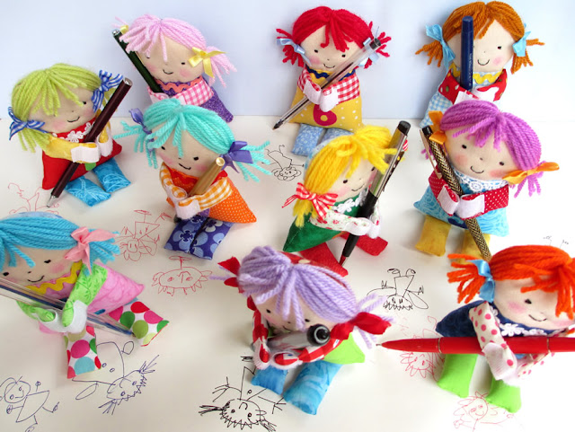 I've recently been having enormous fun making these little rascals and writing their pattern for my Etsy shop. I was originally only going to make two or three but the family quickly grew. They are such amusing little characters that I was unable to get off the dolly-go-round and eventually came to halt when I'd completed ten.