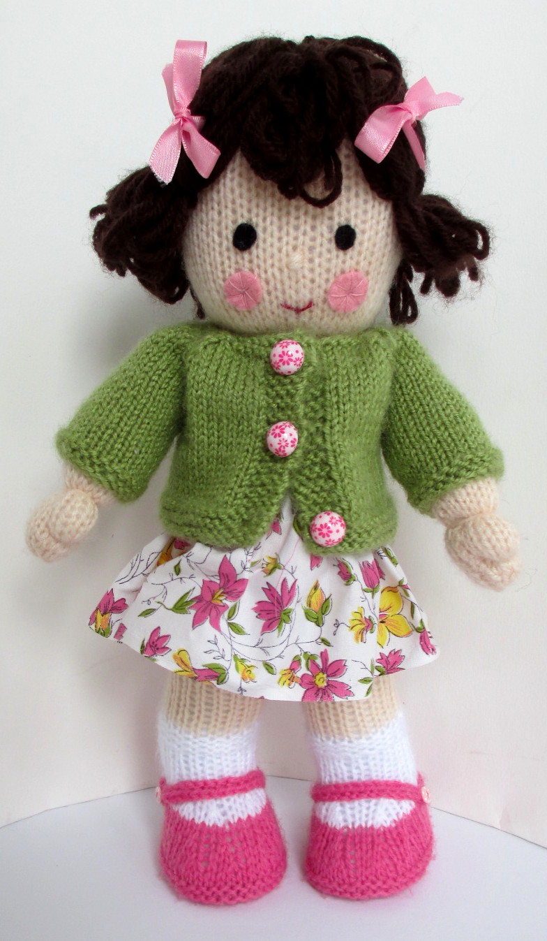 I'd just like to put a good word in for green yarn. When I ask for green DK in wool shops I'm invariably told it isn't popular so green isn't stocked. This is a shame as I'm lost without green in my yarn colour palette. When knitting dolls it is natural to choose pastel shades and pink is very definitely the number one favourite. When I made Kate she reminded me of a little girl I sat next to at school when I was six. She often wore a green cardigan and in my yarn stash I had just the right shade. So I made Kate a green cardigan and have been amazed at the number of knitters who have said they like it. My school friend's green cardigan didn't have pink buttons but Kate insisted on having them!!