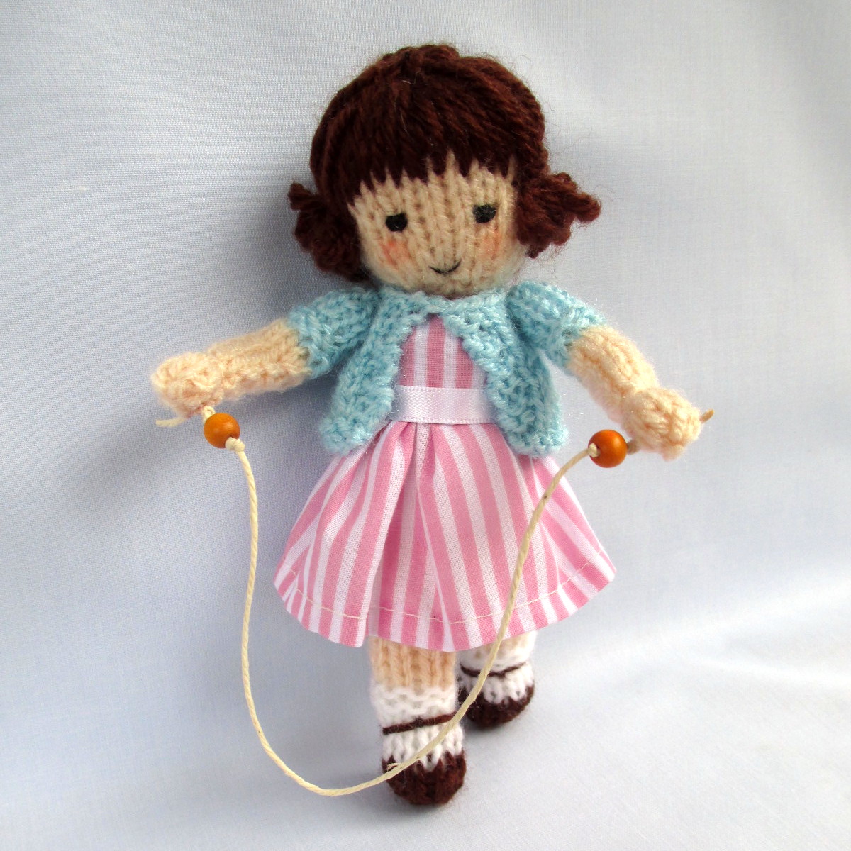 Four cute 15cm (6in) knitted dolls with their skipping ropes. Maggie, Mary, Milly and May are made from the same basic pattern but their pretty clothes and hair styles give them a very different appearance.