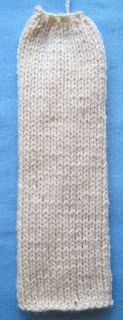 Pictured below you can see a knitted piece from one of my dolls. The head and body are knitted as one. The knitting is then folded in half (lengthways) and the seam stitched. I think you’ll agree that at this stage it bears no resemblance to a doll.